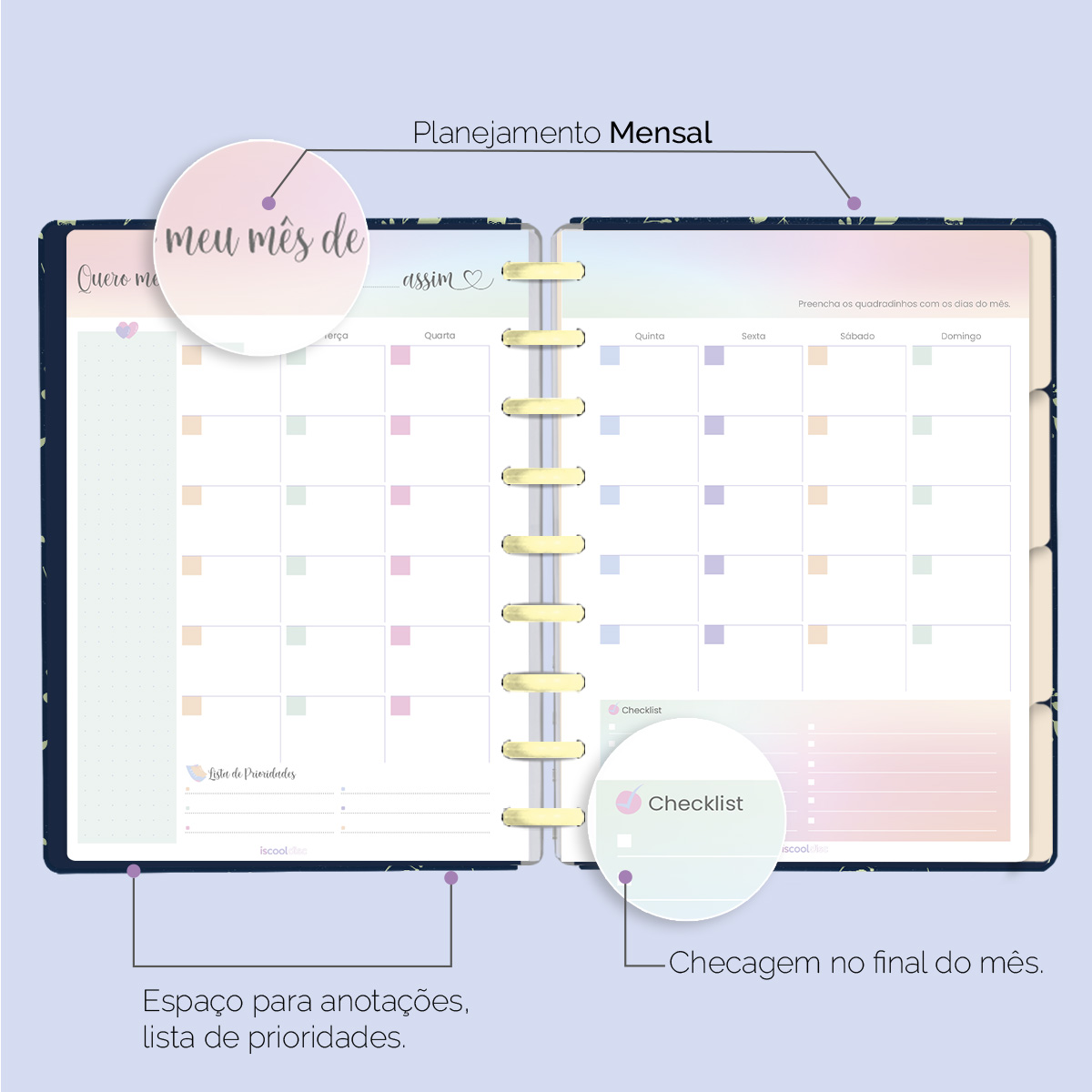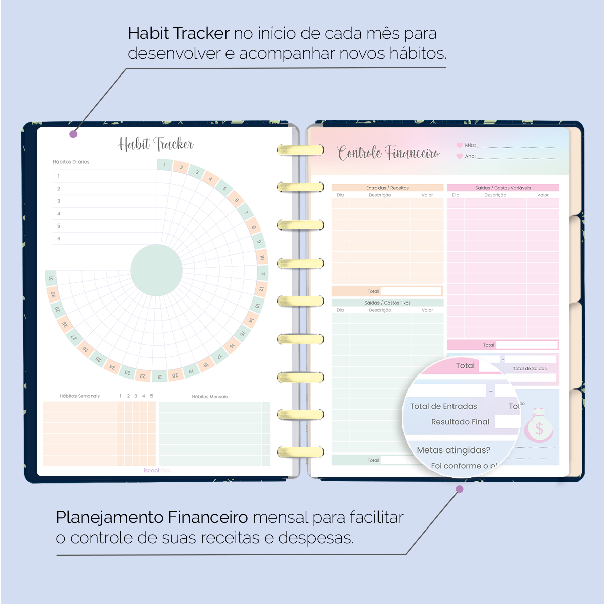 No início de cada mês, há um planejamento mensal, facilitando visualmente as suas principais anotações, um "Habit Tracker" para você desenvolver novos hábitos ou controlar os mais importantes, e ainda um planejamento financeiro, facilitando o controle das suas receitas e despesas, além de inúmeras outras funcionalidades.