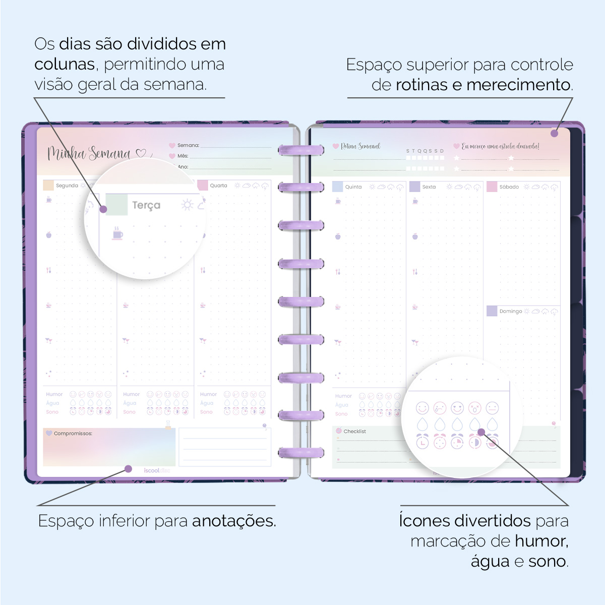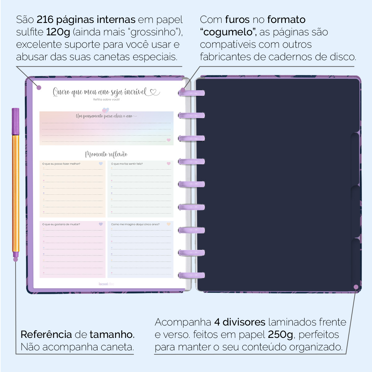 Além de tudo isso, o ISCOOL DISC Planner Permanente conta com detalhes que fazem toda a diferença: elástico para fechamento da capa, proporcionando muito mais estilo e privacidade para suas anotações; bolsa plástica para guardar seus rascunhos, referências, lembretes e documentos; e uma cartela de adesivos incríveis para que você possa personalizar o planner do seu jeitinho!