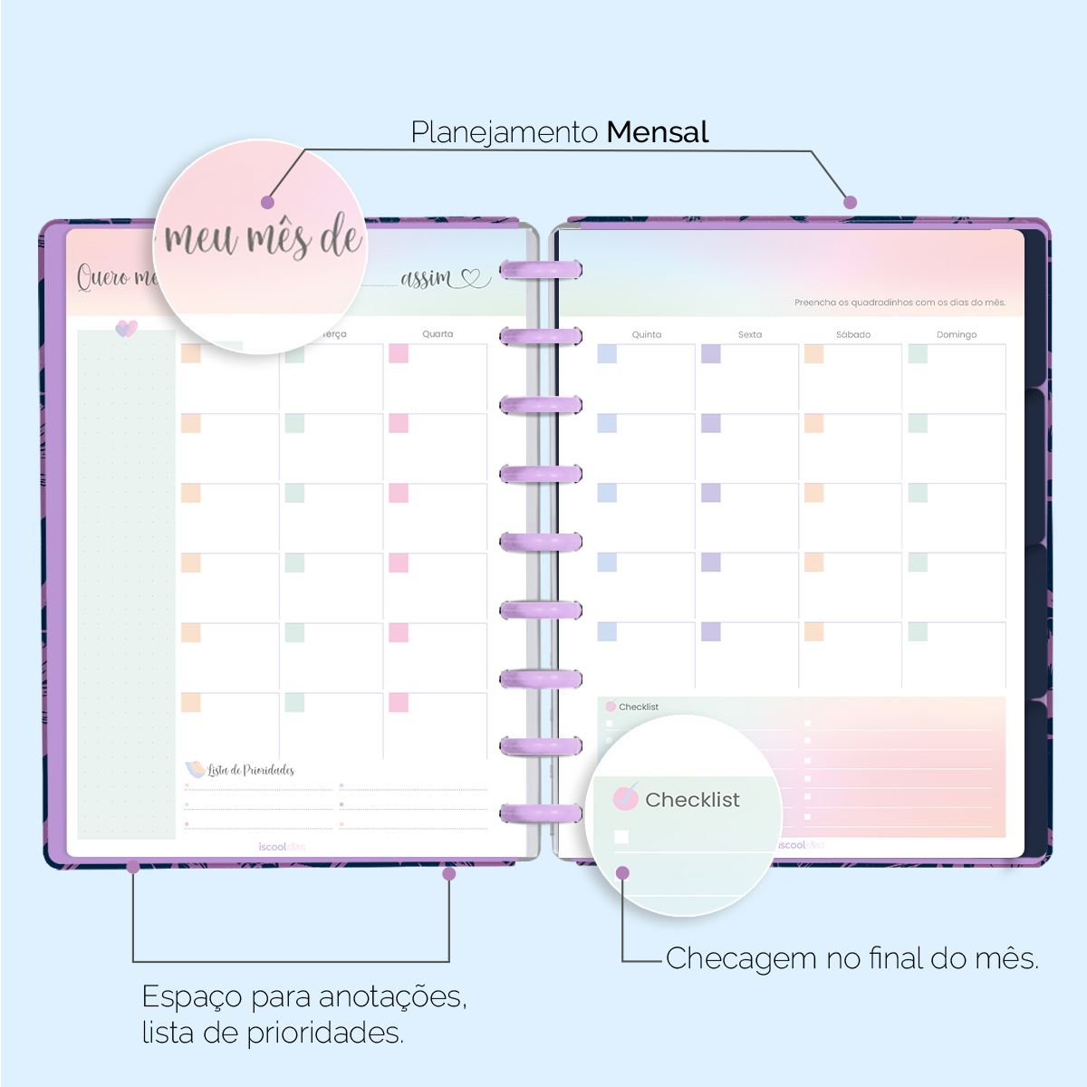 O ISCOOL DISC Planner Permanente foi criado especialmente para ajudar você a alcançar todas as suas metas e objetivos pessoais. É um planner totalmente customizável, no qual os elementos são reposicionáveis. Você pode montá-lo como preferir, deixando sua criatividade fluir livremente.