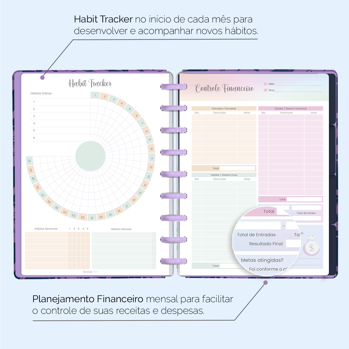 No início de cada mês, há um planejamento mensal, facilitando visualmente as suas principais anotações, um "Habit Tracker" para você desenvolver novos hábitos ou controlar os mais importantes, e ainda um planejamento financeiro, facilitando o controle das suas receitas e despesas, além de inúmeras outras funcionalidades.