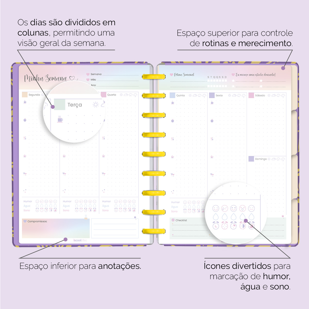 Os dias são divididos em colunas, permitindo uma visão geral da semana, onde você mesmo irá indicar o dia, a semana, o mês e o ano. Assim, você pode utilizar o seu planner independentemente do ano em que estivermos. Não é incrível?