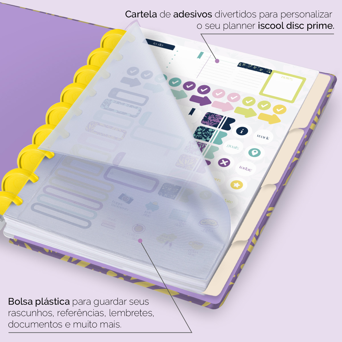 Além de tudo isso, o ISCOOL DISC Planner Permanente conta com detalhes que fazem toda a diferença: elástico para fechamento da capa, proporcionando muito mais estilo e privacidade para suas anotações; bolsa plástica para guardar seus rascunhos, referências, lembretes e documentos; e uma cartela de adesivos incríveis para que você possa personalizar o planner do seu jeitinho!