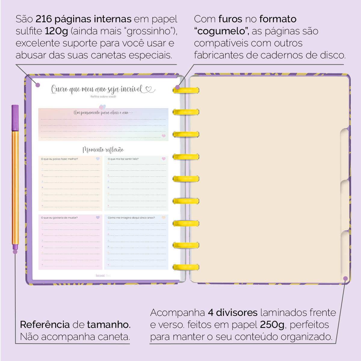 O miolo conta com páginas decoradas em papel sulfite 120g (aquele papel ainda mais "grossinho"), para que você use e abuse das suas canetas especiais. Com furos no formato de "cogumelo", você poderá dar um "up" nele com nossos refis, além de ser compatível com outros fabricantes de cadernos e planners de discos.