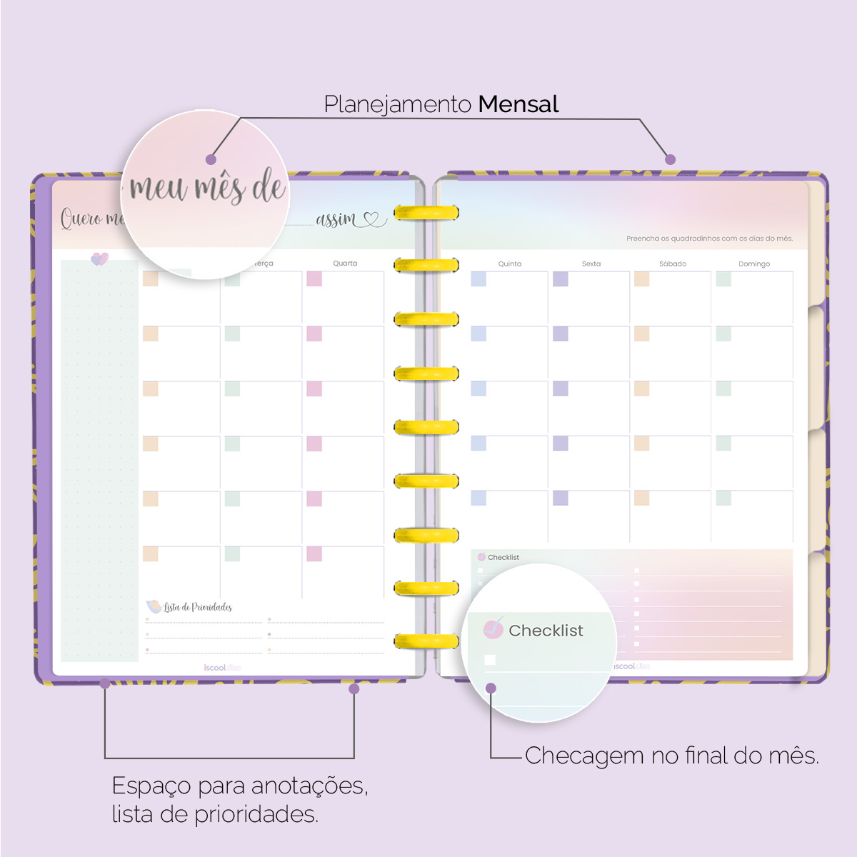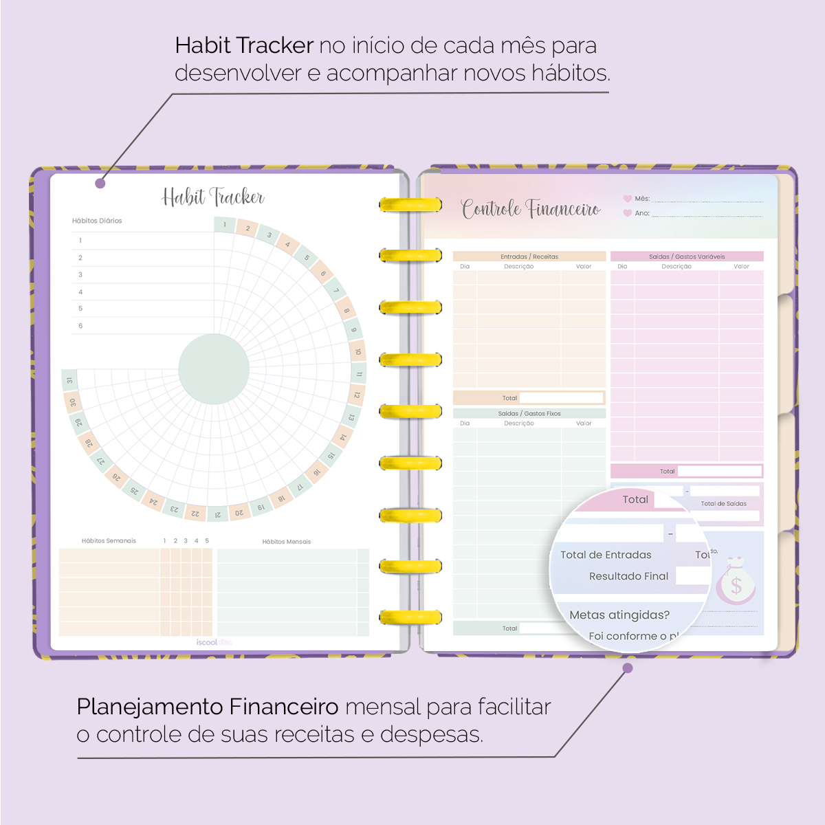 No início de cada mês, há um planejamento mensal, facilitando visualmente as suas principais anotações, um "Habit Tracker" para você desenvolver novos hábitos ou controlar os mais importantes, e ainda um planejamento financeiro, facilitando o controle das suas receitas e despesas, além de inúmeras outras funcionalidades.