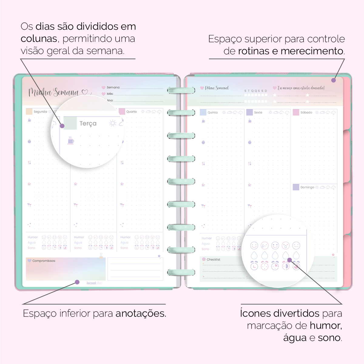 Os dias são divididos em colunas, permitindo uma visão geral da semana, onde você mesmo irá indicar o dia, a semana, o mês e o ano. Assim, você pode utilizar o seu planner independentemente do ano em que estivermos. Não é incrível?