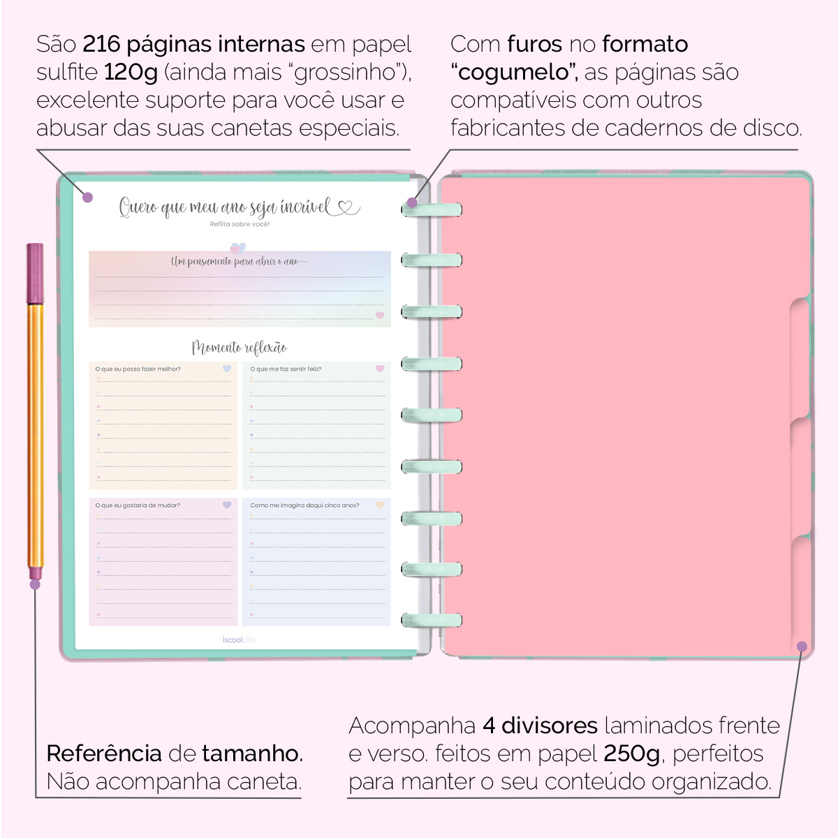 O miolo conta com páginas decoradas em papel sulfite 120g (aquele papel ainda mais "grossinho"), para que você use e abuse das suas canetas especiais. Com furos no formato de "cogumelo", você poderá dar um "up" nele com nossos refis, além de ser compatível com outros fabricantes de cadernos e planners de discos.