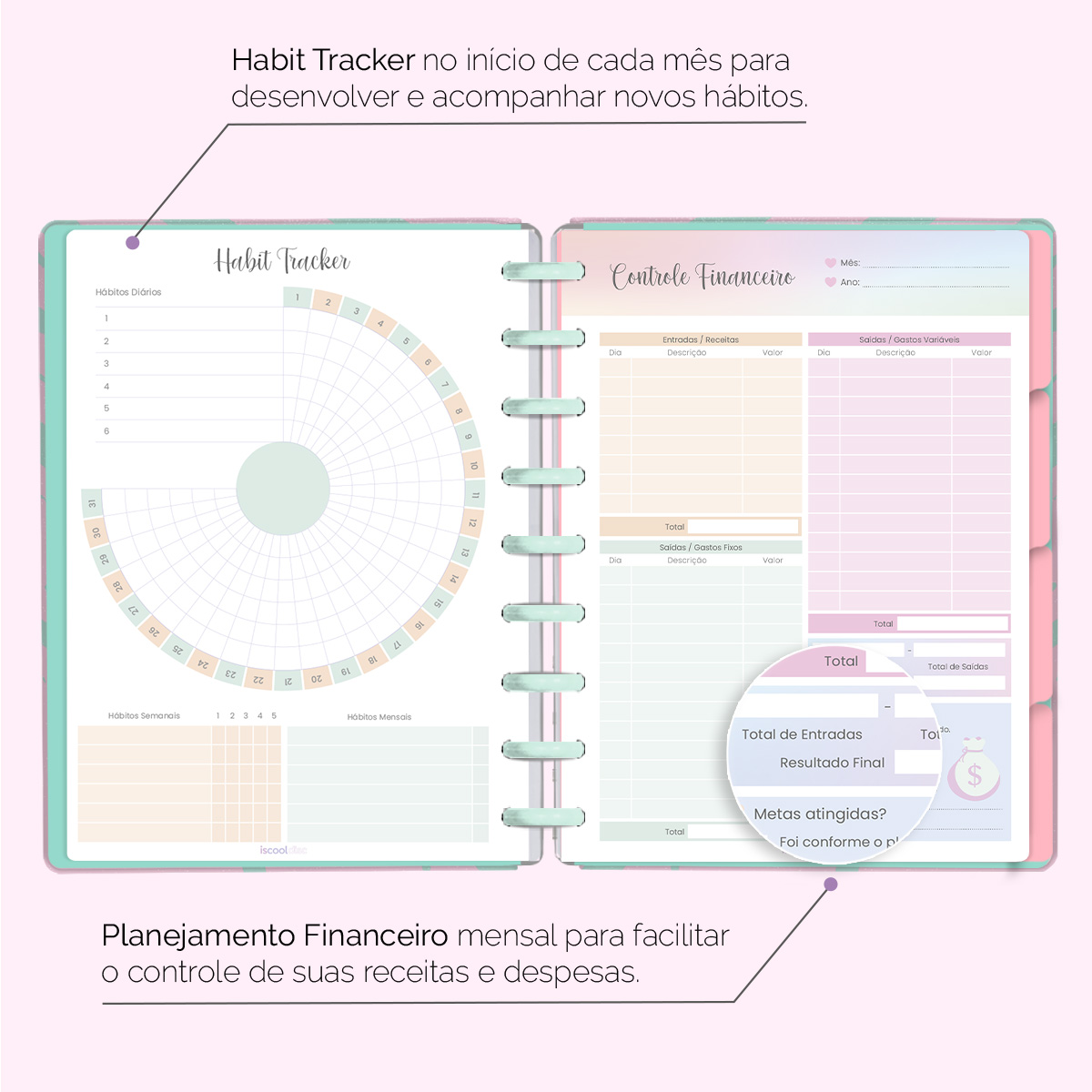 No início de cada mês, há um planejamento mensal, facilitando visualmente as suas principais anotações, um "Habit Tracker" para você desenvolver novos hábitos ou controlar os mais importantes, e ainda um planejamento financeiro, facilitando o controle das suas receitas e despesas, além de inúmeras outras funcionalidades.