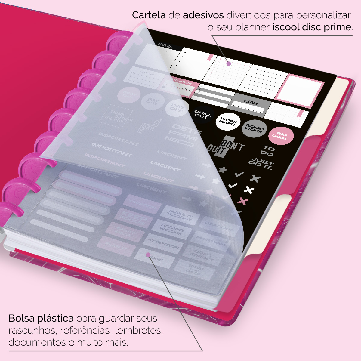 Além de tudo isso, o ISCOOL DISC Planner Permanente conta com detalhes que fazem toda a diferença: elástico para fechamento da capa, proporcionando muito mais estilo e privacidade para suas anotações; bolsa plástica para guardar seus rascunhos, referências, lembretes e documentos; e uma cartela de adesivos incríveis para que você possa personalizar o planner do seu jeitinho!