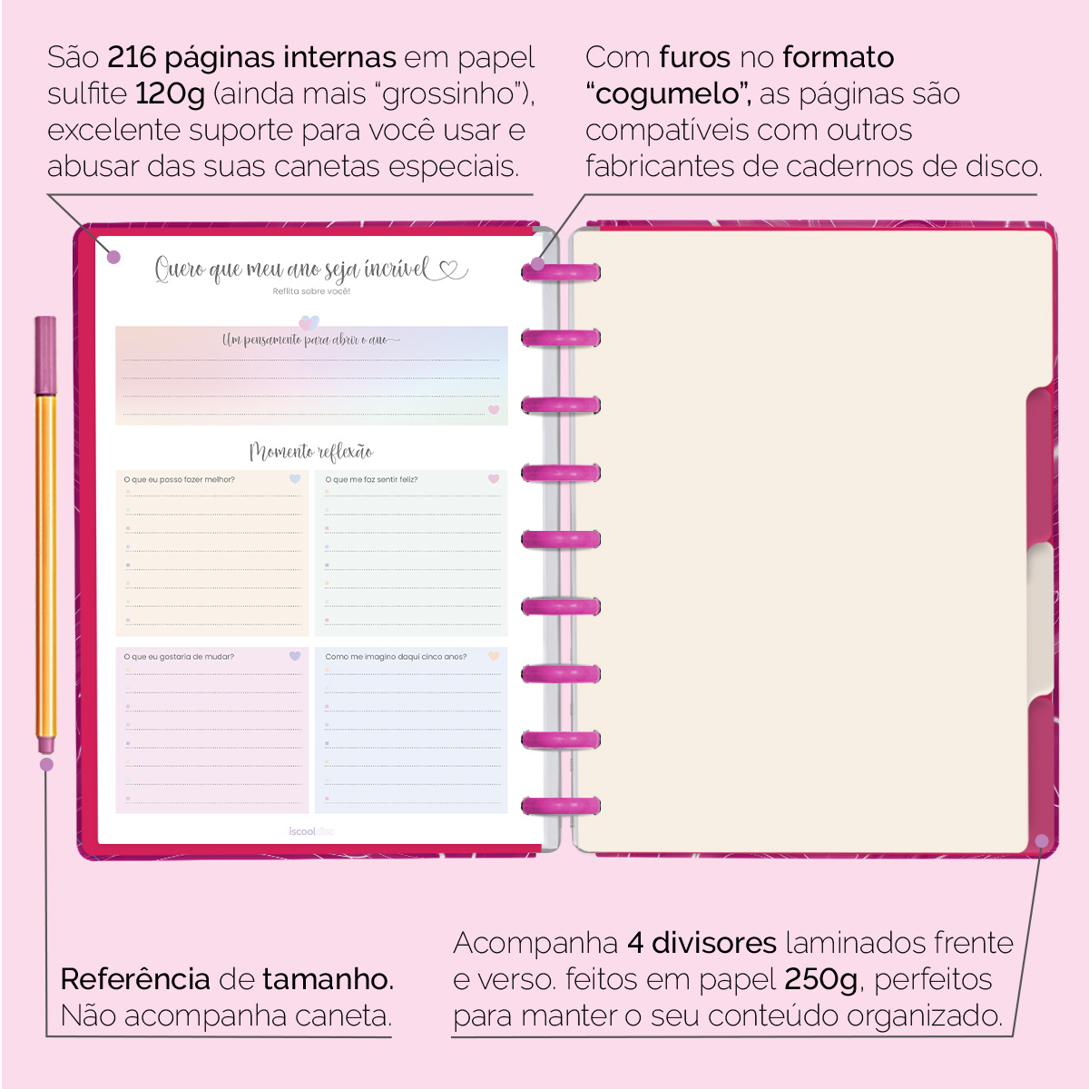 O miolo conta com páginas decoradas em papel sulfite 120g (aquele papel ainda mais "grossinho"), para que você use e abuse das suas canetas especiais. Com furos no formato de "cogumelo", você poderá dar um "up" nele com nossos refis, além de ser compatível com outros fabricantes de cadernos e planners de discos.