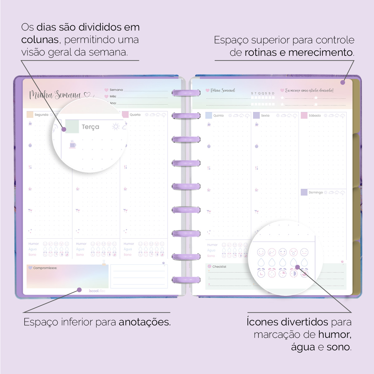 Os dias são divididos em colunas, permitindo uma visão geral da semana, onde você mesmo irá indicar o dia, a semana, o mês e o ano. Assim, você pode utilizar o seu planner independentemente do ano em que estivermos. Não é incrível?