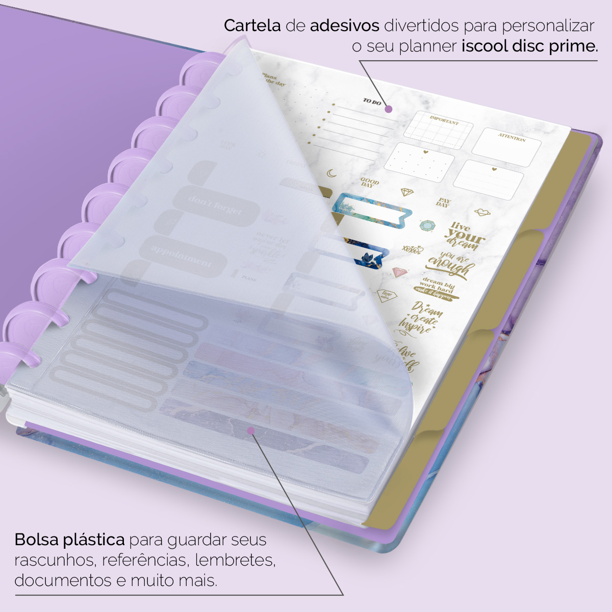 Além de tudo isso, o ISCOOL DISC Planner Permanente conta com detalhes que fazem toda a diferença: elástico para fechamento da capa, proporcionando muito mais estilo e privacidade para suas anotações; bolsa plástica para guardar seus rascunhos, referências, lembretes e documentos; e uma cartela de adesivos incríveis para que você possa personalizar o planner do seu jeitinho!