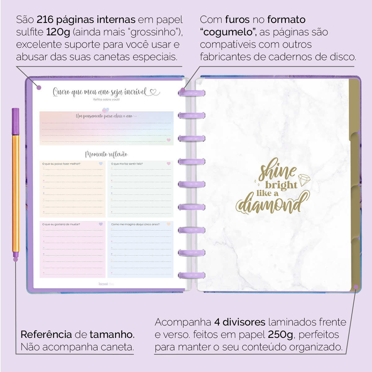 O miolo conta com páginas decoradas em papel sulfite 120g (aquele papel ainda mais "grossinho"), para que você use e abuse das suas canetas especiais. Com furos no formato de "cogumelo", você poderá dar um "up" nele com nossos refis, além de ser compatível com outros fabricantes de cadernos e planners de discos.