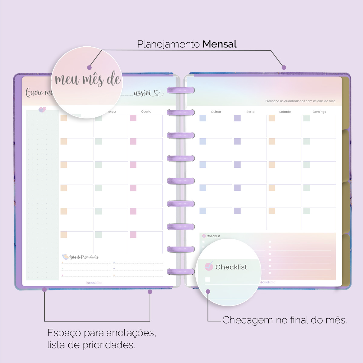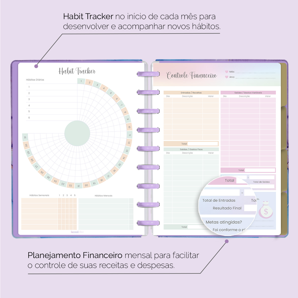 No início de cada mês, há um planejamento mensal, facilitando visualmente as suas principais anotações, um "Habit Tracker" para você desenvolver novos hábitos ou controlar os mais importantes, e ainda um planejamento financeiro, facilitando o controle das suas receitas e despesas, além de inúmeras outras funcionalidades.