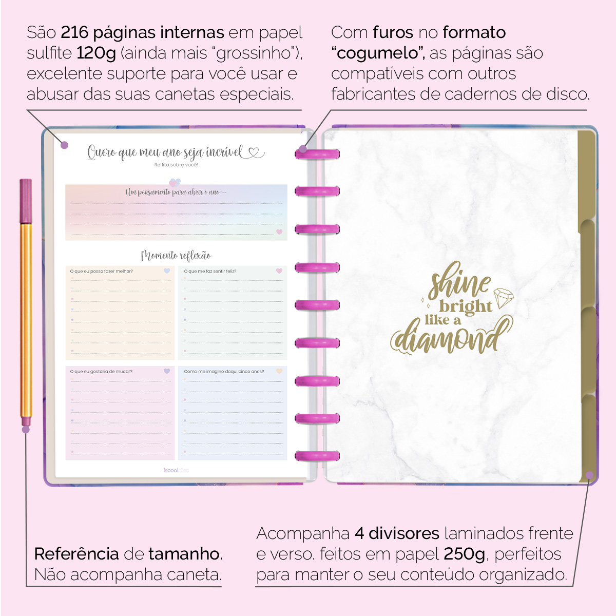 Além de tudo isso, o ISCOOL DISC Planner Permanente conta com detalhes que fazem toda a diferença: elástico para fechamento da capa, proporcionando muito mais estilo e privacidade para suas anotações; bolsa plástica para guardar seus rascunhos, referências, lembretes e documentos; e uma cartela de adesivos incríveis para que você possa personalizar o planner do seu jeitinho!