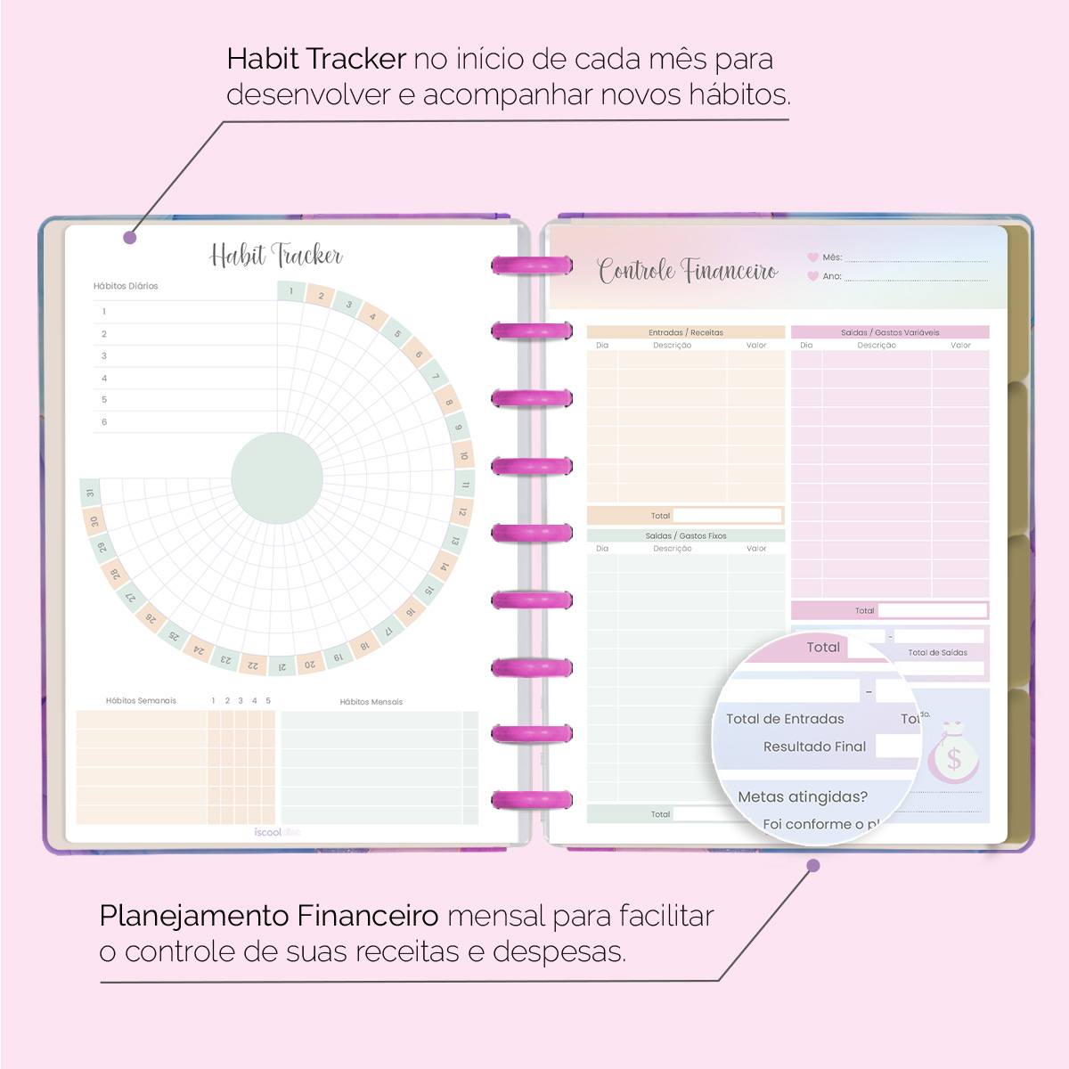 No início de cada mês, há um planejamento mensal, facilitando visualmente as suas principais anotações, um "Habit Tracker" para você desenvolver novos hábitos ou controlar os mais importantes, e ainda um planejamento financeiro, facilitando o controle das suas receitas e despesas, além de inúmeras outras funcionalidades.