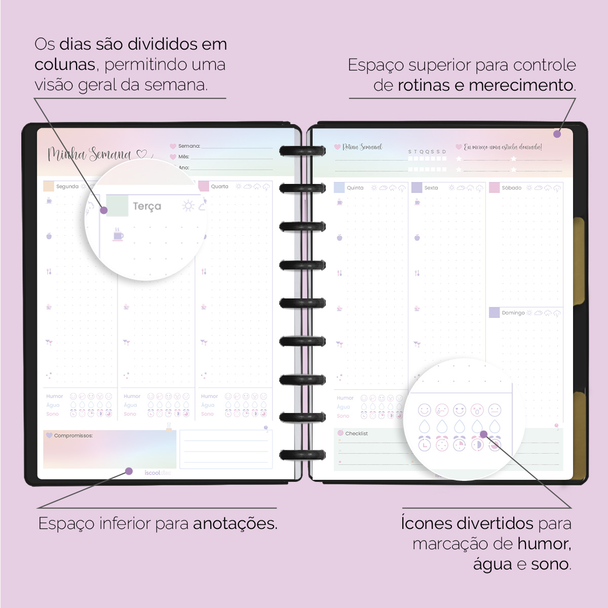 Os dias são divididos em colunas, permitindo uma visão geral da semana, onde você mesmo irá indicar o dia, a semana, o mês e o ano. Assim, você pode utilizar o seu planner independentemente do ano em que estivermos. Não é incrível?