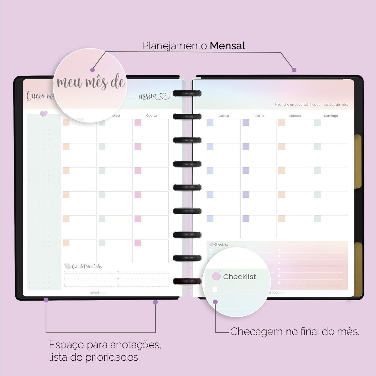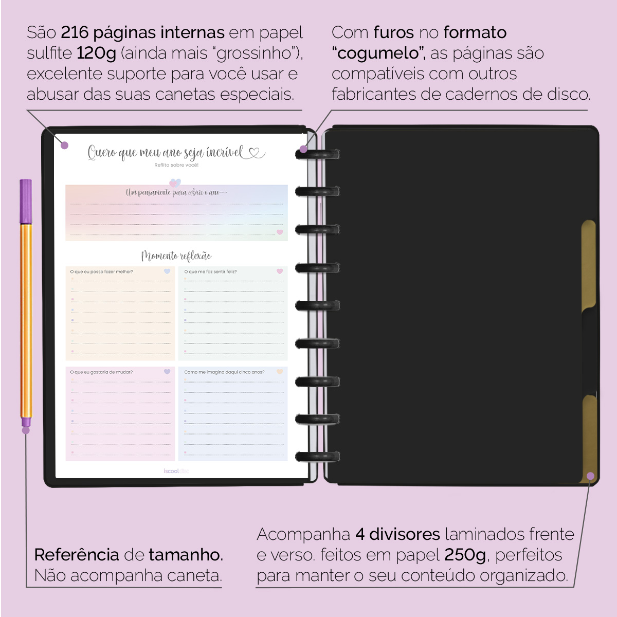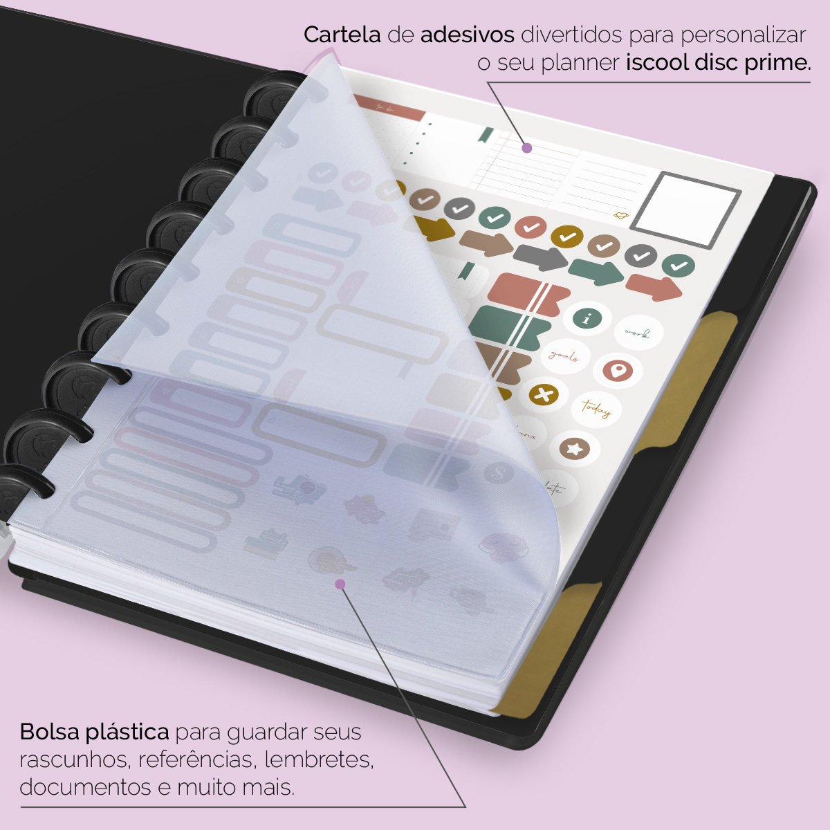 Além de tudo isso, o ISCOOL DISC Planner Permanente conta com detalhes que fazem toda a diferença: elástico para fechamento da capa, proporcionando muito mais estilo e privacidade para suas anotações; bolsa plástica para guardar seus rascunhos, referências, lembretes e documentos; e uma cartela de adesivos incríveis para que você possa personalizar o planner do seu jeitinho!