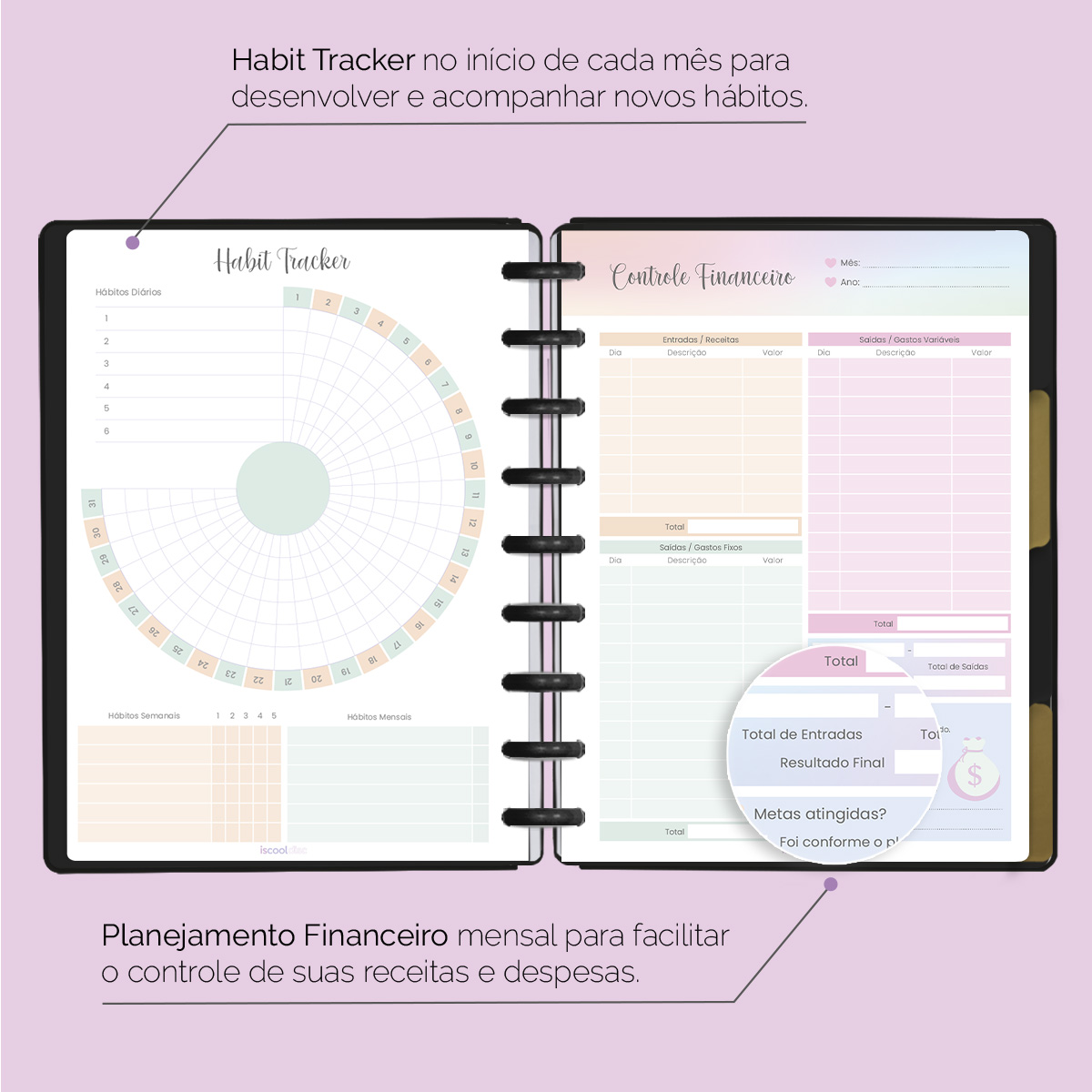 No início de cada mês, há um planejamento mensal, facilitando visualmente as suas principais anotações, um "Habit Tracker" para você desenvolver novos hábitos ou controlar os mais importantes, e ainda um planejamento financeiro, facilitando o controle das suas receitas e despesas, além de inúmeras outras funcionalidades.