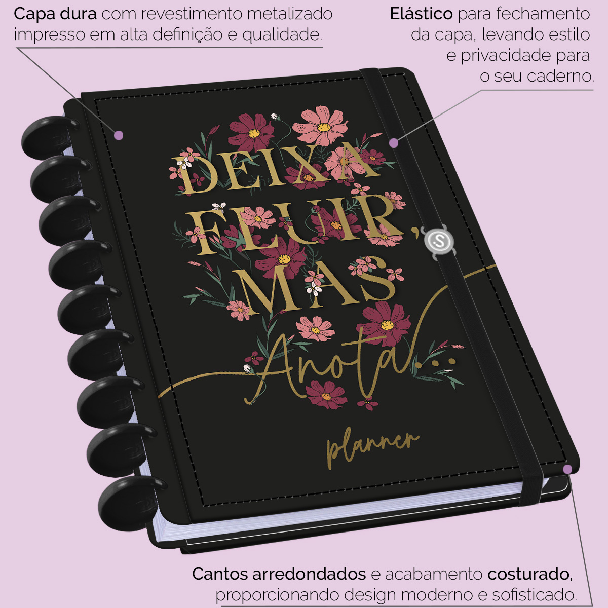 A capa é dura, com impressão digital de alta definição, e acompanha 4 lindas divisórias que você pode colocar em qualquer local do planner, funcionando como o guia perfeito para sua organização.