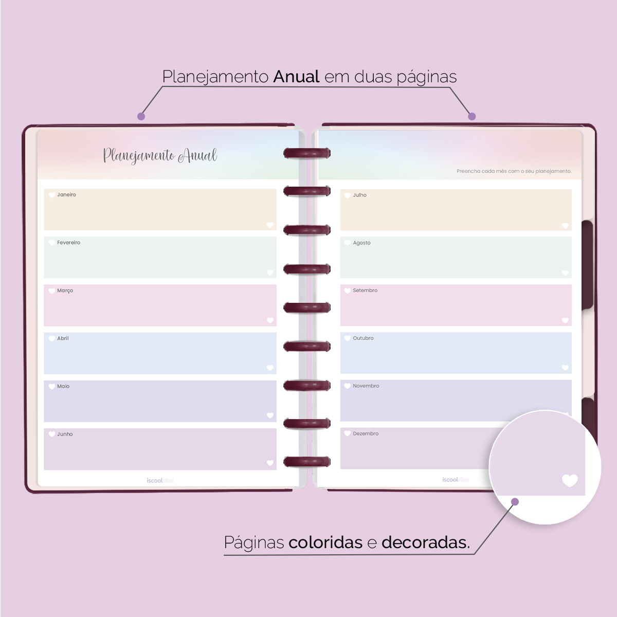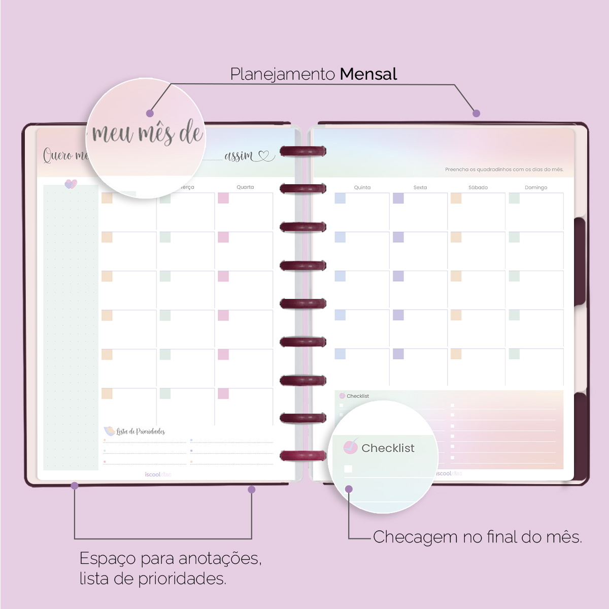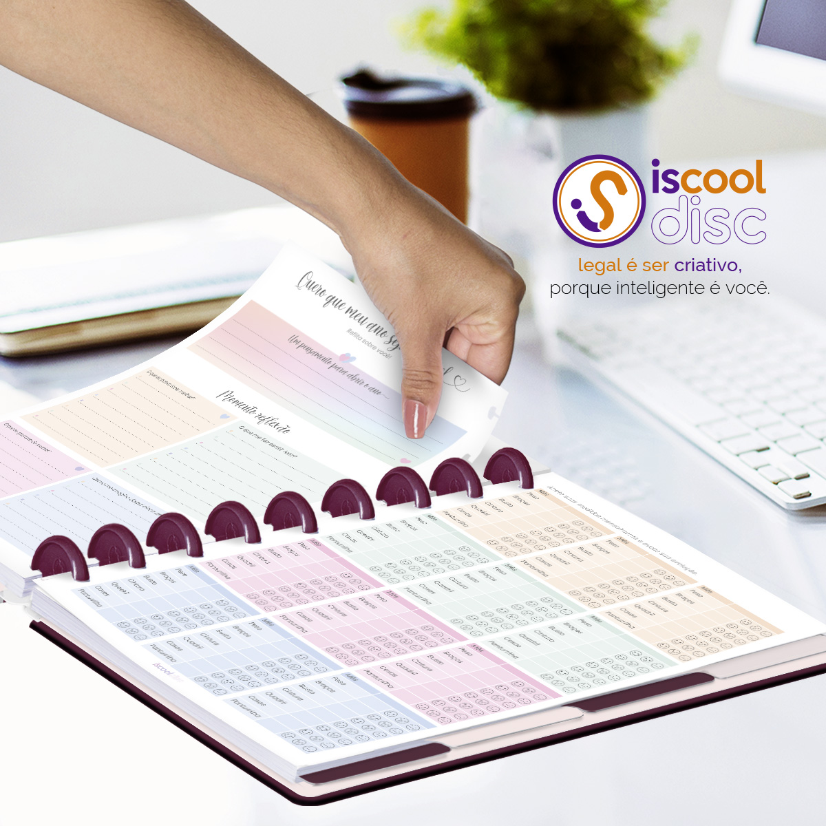 O ISCOOL DISC Planner Permanente foi criado especialmente para ajudar você a alcançar todas as suas metas e objetivos pessoais. É um planner totalmente customizável, no qual os elementos são reposicionáveis. Você pode montá-lo como preferir, deixando sua criatividade fluir livremente.