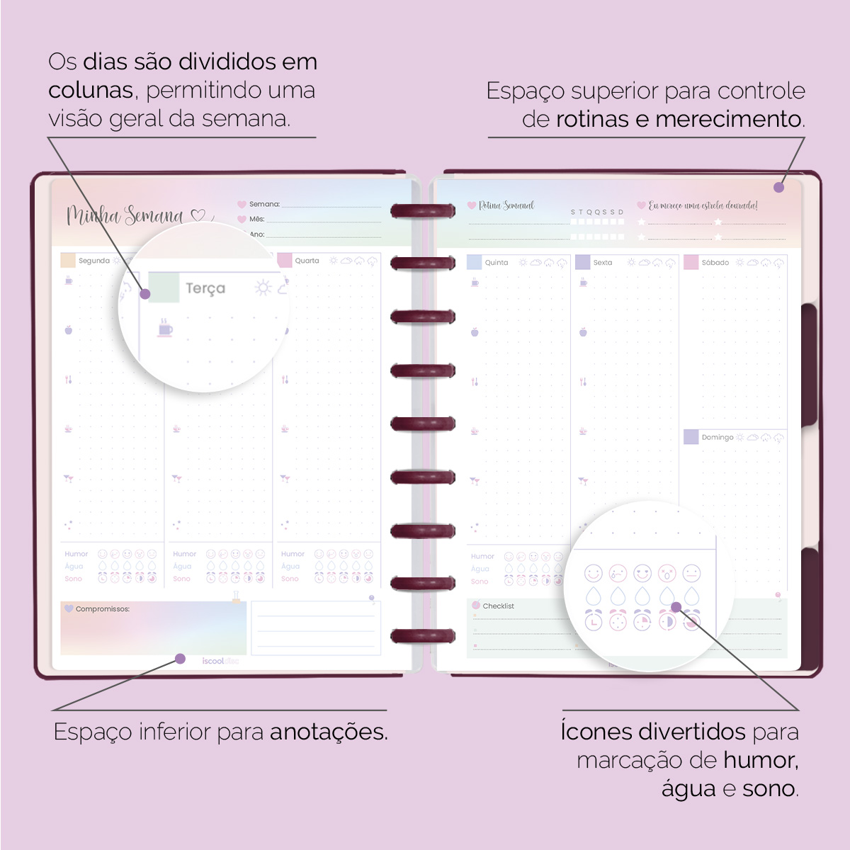 Os dias são divididos em colunas, permitindo uma visão geral da semana, onde você mesmo irá indicar o dia, a semana, o mês e o ano. Assim, você pode utilizar o seu planner independentemente do ano em que estivermos. Não é incrível?