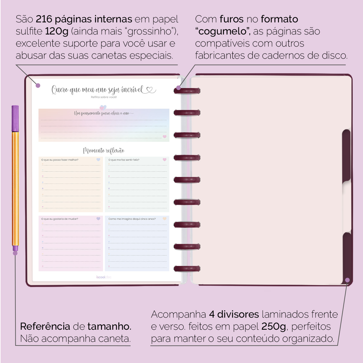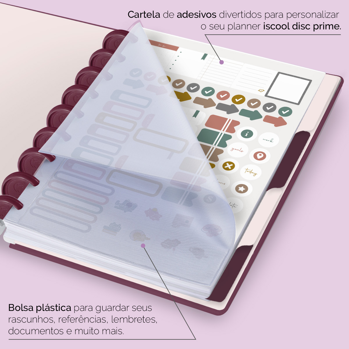 Além de tudo isso, o ISCOOL DISC Planner Permanente conta com detalhes que fazem toda a diferença: elástico para fechamento da capa, proporcionando muito mais estilo e privacidade para suas anotações; bolsa plástica para guardar seus rascunhos, referências, lembretes e documentos; e uma cartela de adesivos incríveis para que você possa personalizar o planner do seu jeitinho!