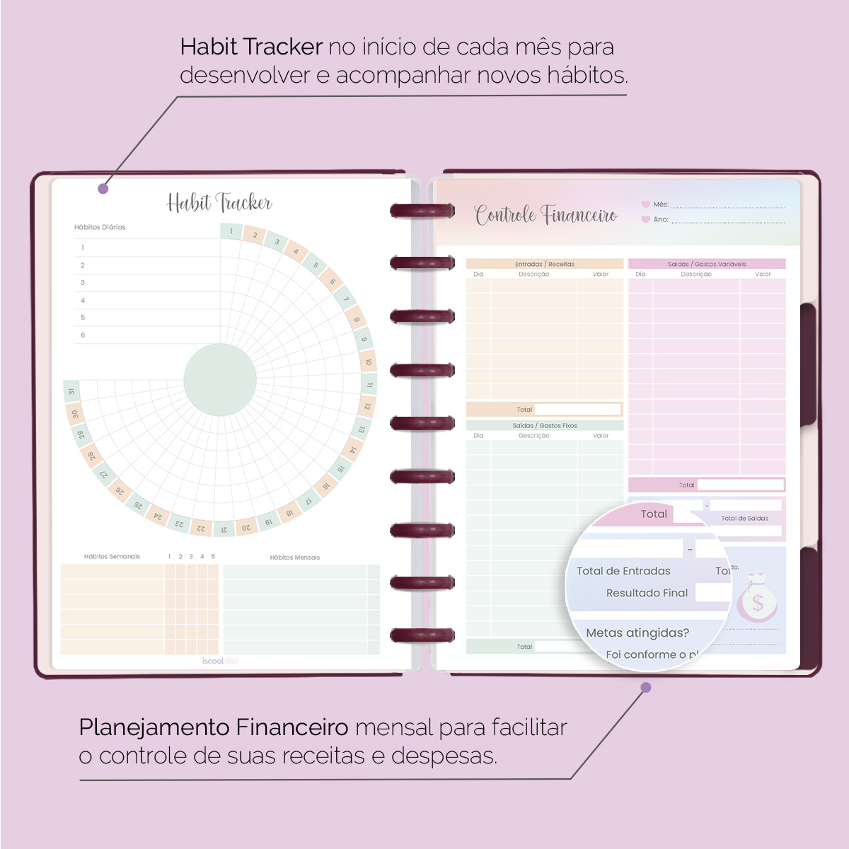 No início de cada mês, há um planejamento mensal, facilitando visualmente as suas principais anotações, um "Habit Tracker" para você desenvolver novos hábitos ou controlar os mais importantes, e ainda um planejamento financeiro, facilitando o controle das suas receitas e despesas, além de inúmeras outras funcionalidades.