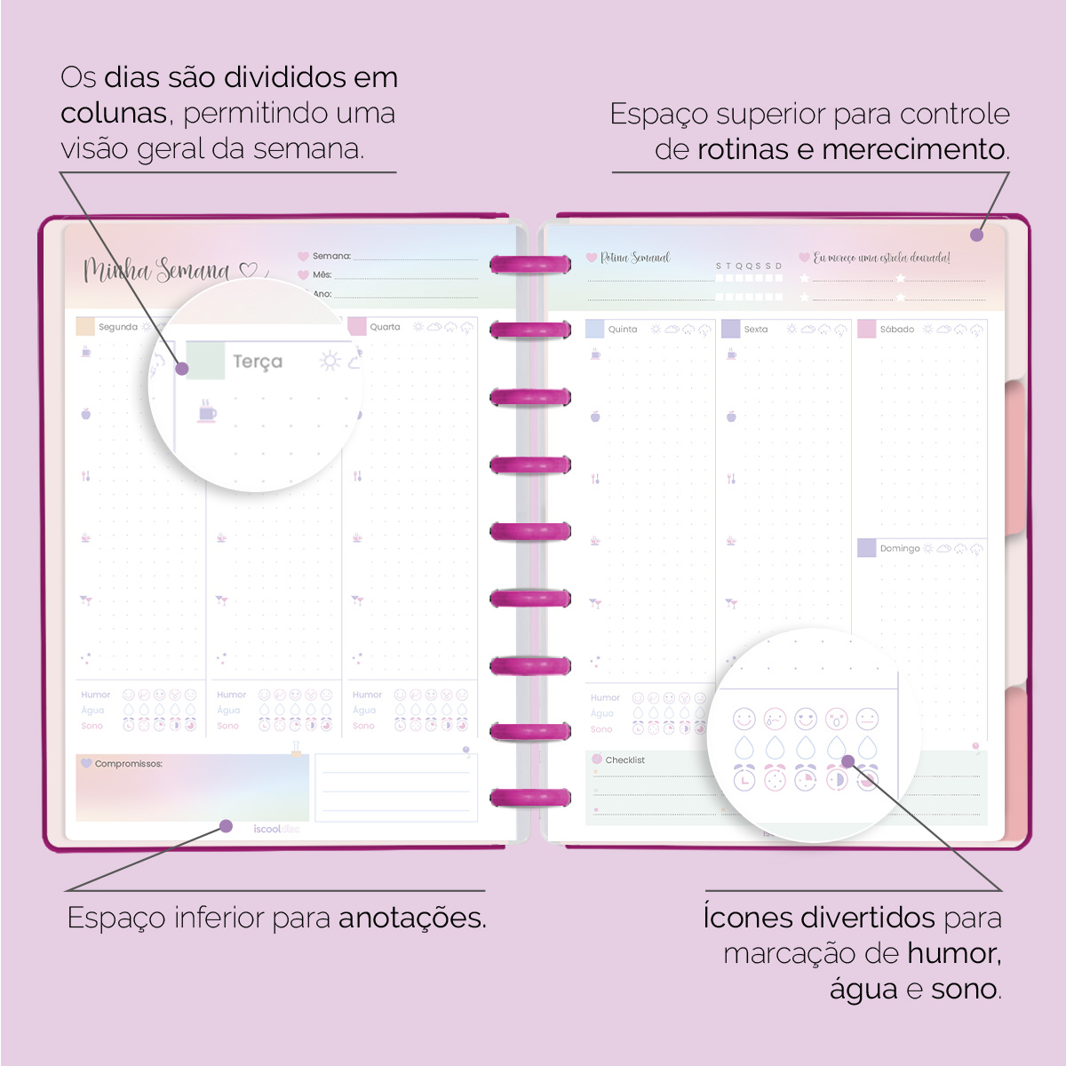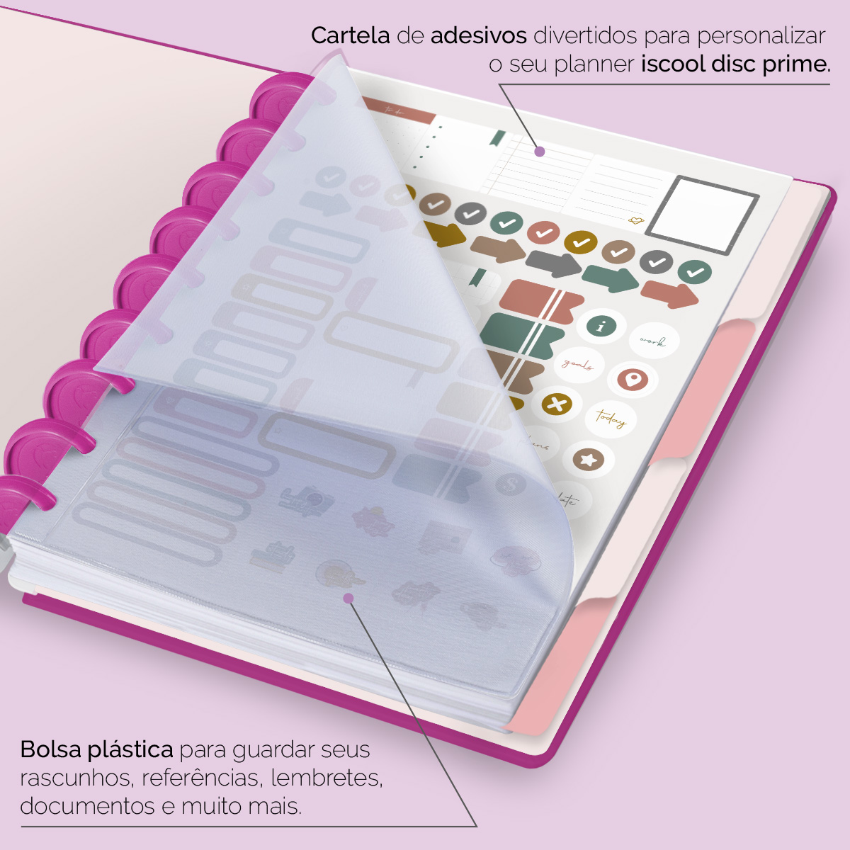 Além de tudo isso, o ISCOOL DISC Planner Permanente conta com detalhes que fazem toda a diferença: elástico para fechamento da capa, proporcionando muito mais estilo e privacidade para suas anotações; bolsa plástica para guardar seus rascunhos, referências, lembretes e documentos; e uma cartela de adesivos incríveis para que você possa personalizar o planner do seu jeitinho!