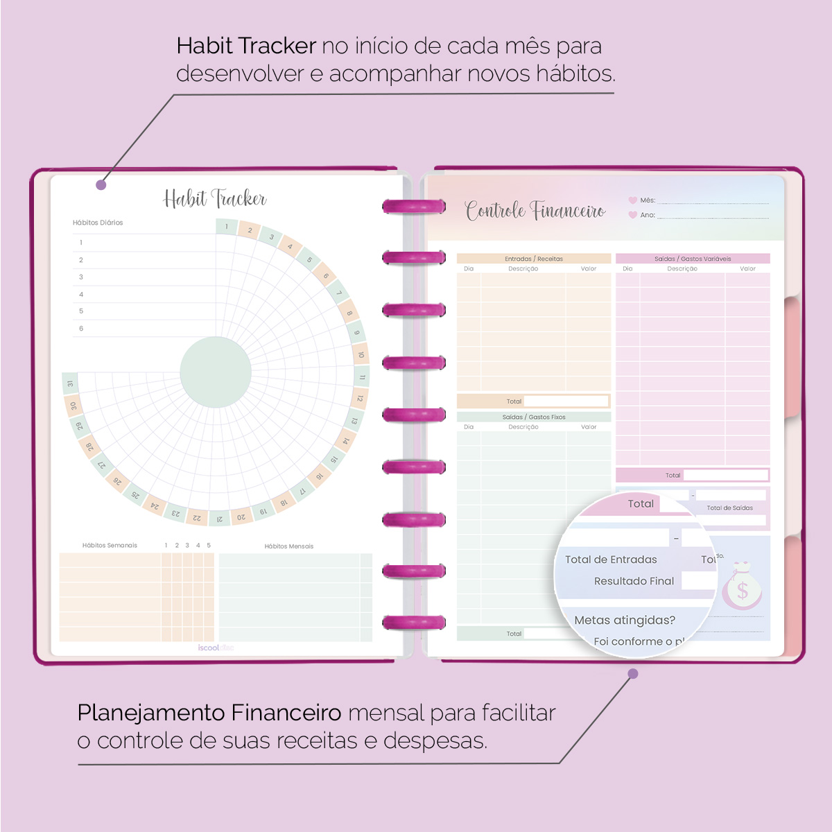 No início de cada mês, há um planejamento mensal, facilitando visualmente as suas principais anotações, um "Habit Tracker" para você desenvolver novos hábitos ou controlar os mais importantes, e ainda um planejamento financeiro, facilitando o controle das suas receitas e despesas, além de inúmeras outras funcionalidades.