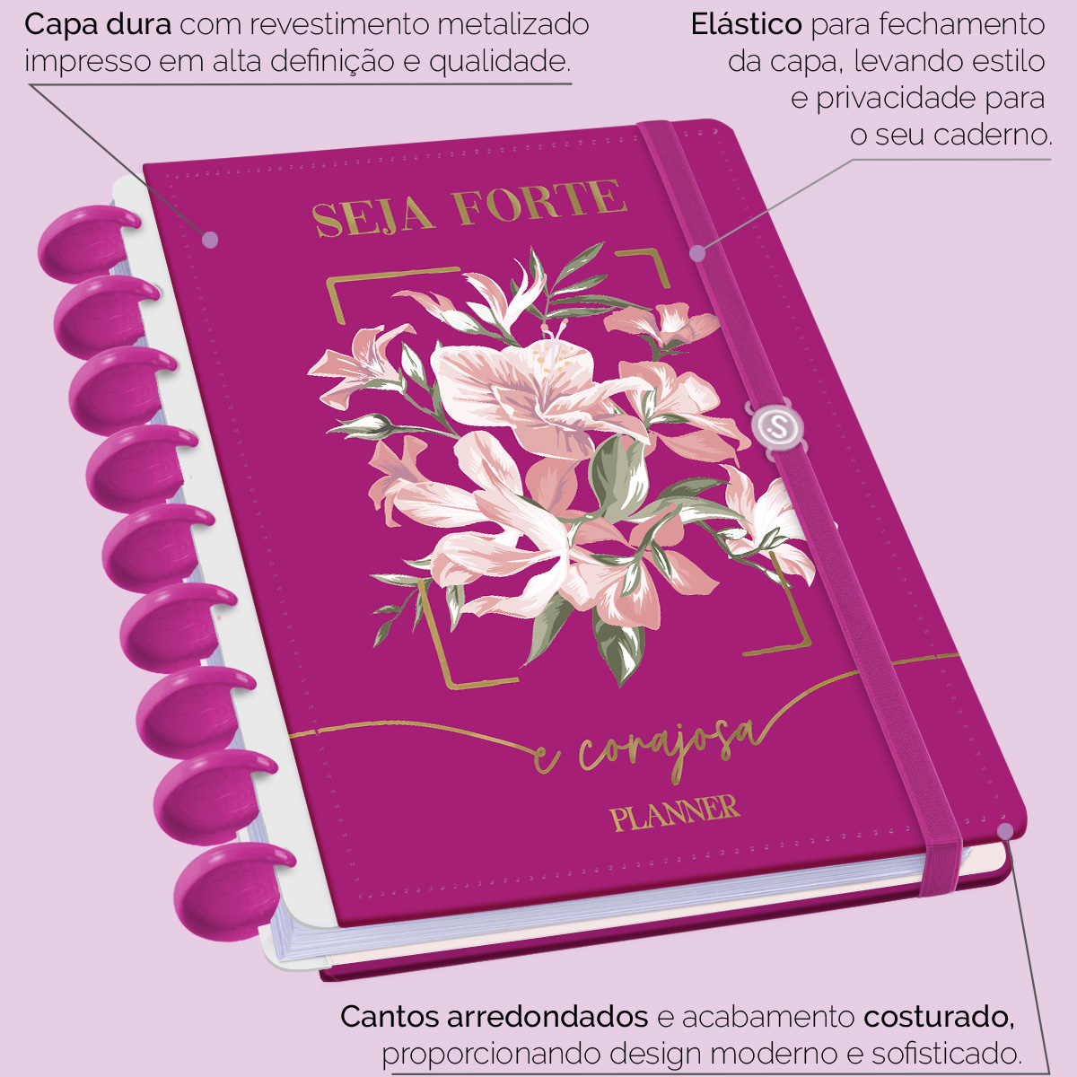 A capa é dura, com impressão digital de alta definição, e acompanha 4 lindas divisórias que você pode colocar em qualquer local do planner, funcionando como o guia perfeito para sua organização.