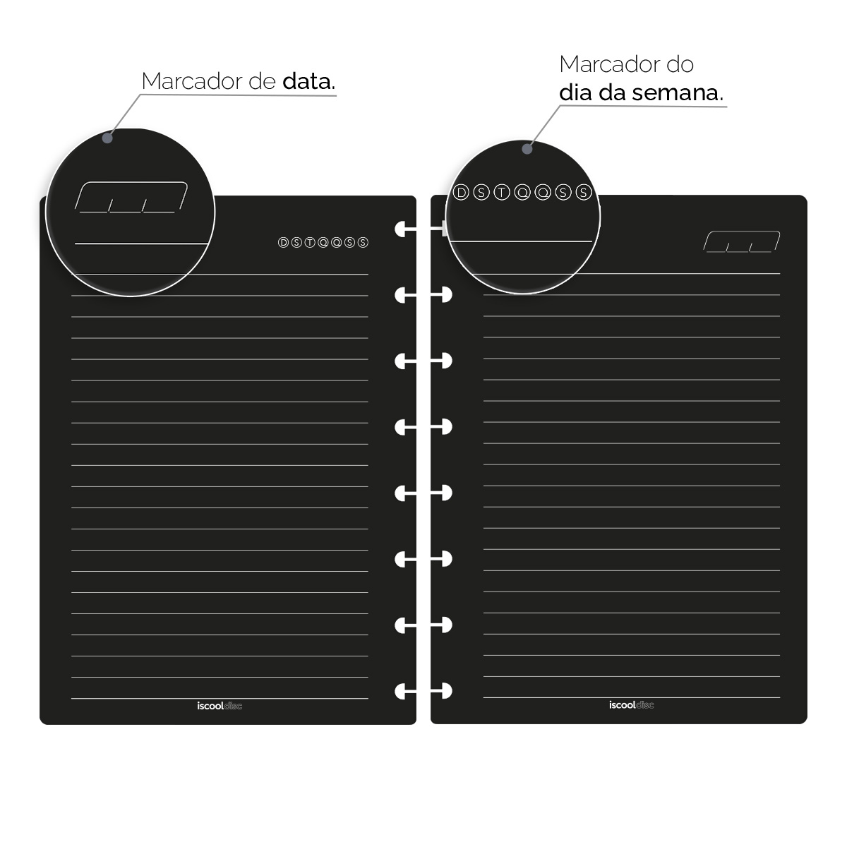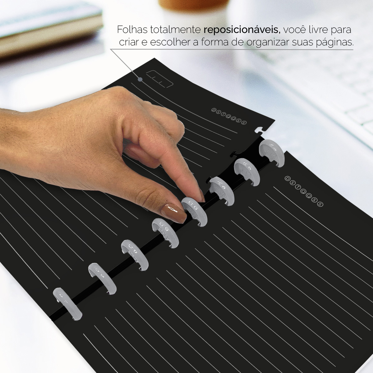 São 30 folhas pautadas com linhas brancas nos tamanhos P (14 cm x 20 cm), M (17 cm x 23 cm) ou G (20 cm x 27,5 cm) em papel sulfite black com gramatura de 120g, o papel mais “grossinho”, deixando rolar solta sua criatividade para utilizar suas canetas mais especiais! As folhas contêm furos em formato de “cogumelo” proporcionando fácil encaixe e desencaixe nos discos, você livre pra montar seu caderno como quiser!
