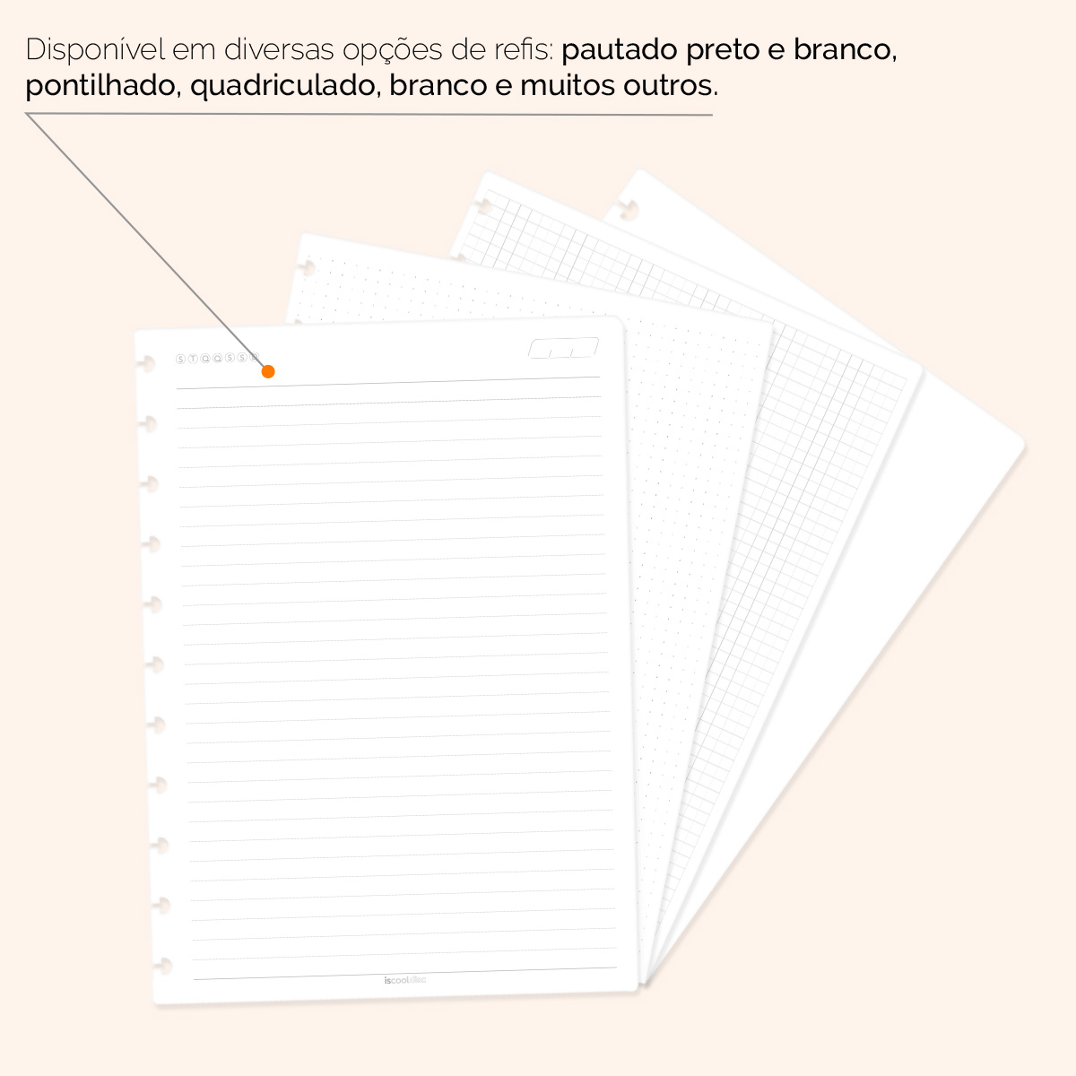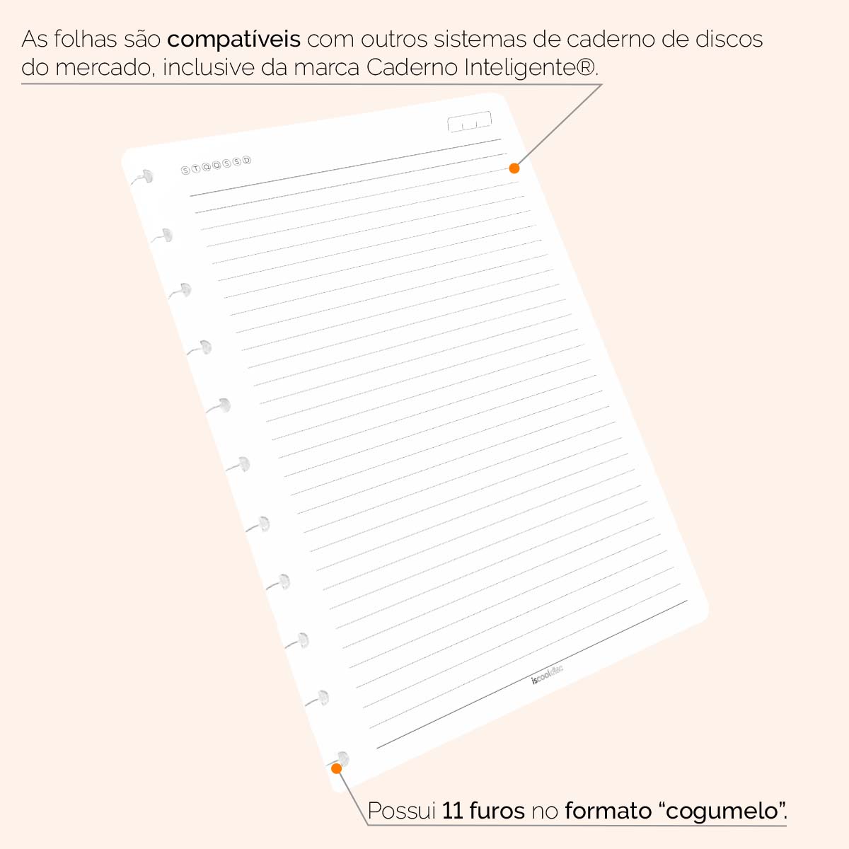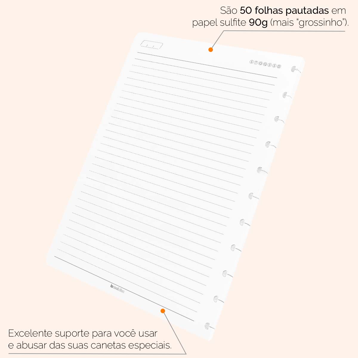 São 50 folhas pautadas no tamanho Grande 20 x 27,5 cm em papel sulfite/offset com gramatura de 90g, o papel mais “grossinho”, deixando rolar solta sua criatividade para utilizar suas canetas mais especiais! As folhas contêm 11 furos em formato de “cogumelo” proporcionando fácil encaixe e desencaixe nos discos, você livre pra montar seu caderno como quiser!