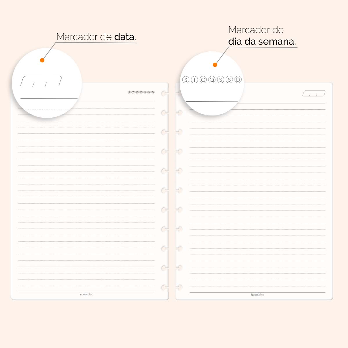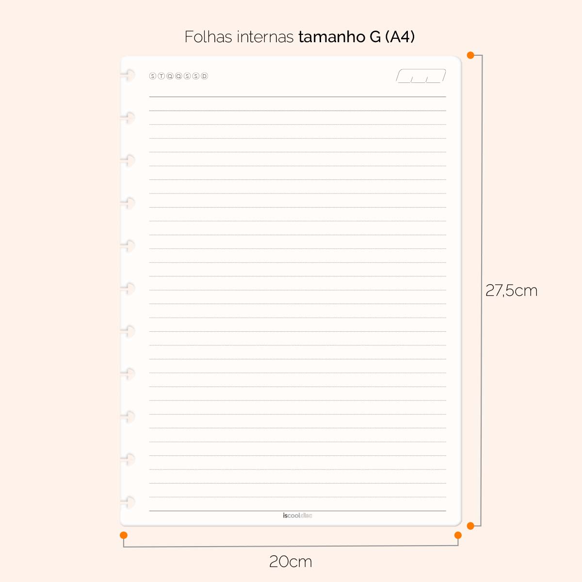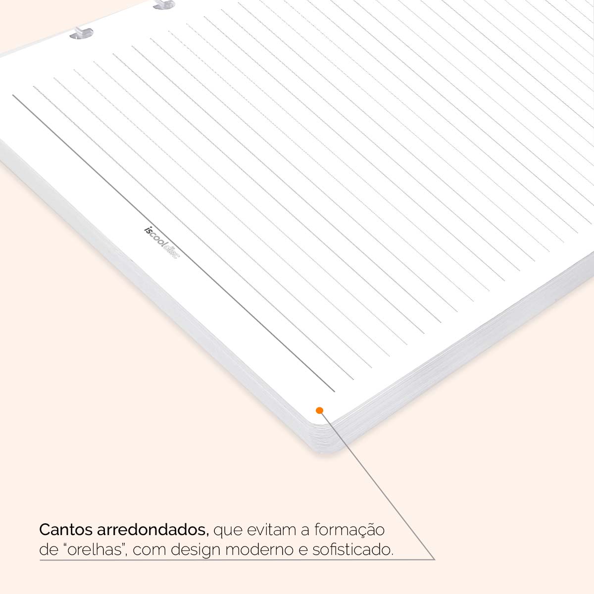 São 50 folhas pautadas no tamanho Grande 20 x 27,5 cm em papel sulfite/offset com gramatura de 90g, o papel mais “grossinho”, deixando rolar solta sua criatividade para utilizar suas canetas mais especiais! As folhas contêm 11 furos em formato de “cogumelo” proporcionando fácil encaixe e desencaixe nos discos, você livre pra montar seu caderno como quiser!