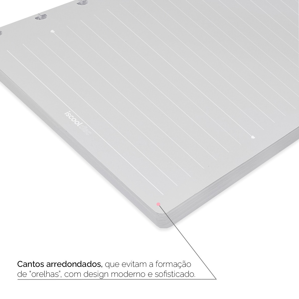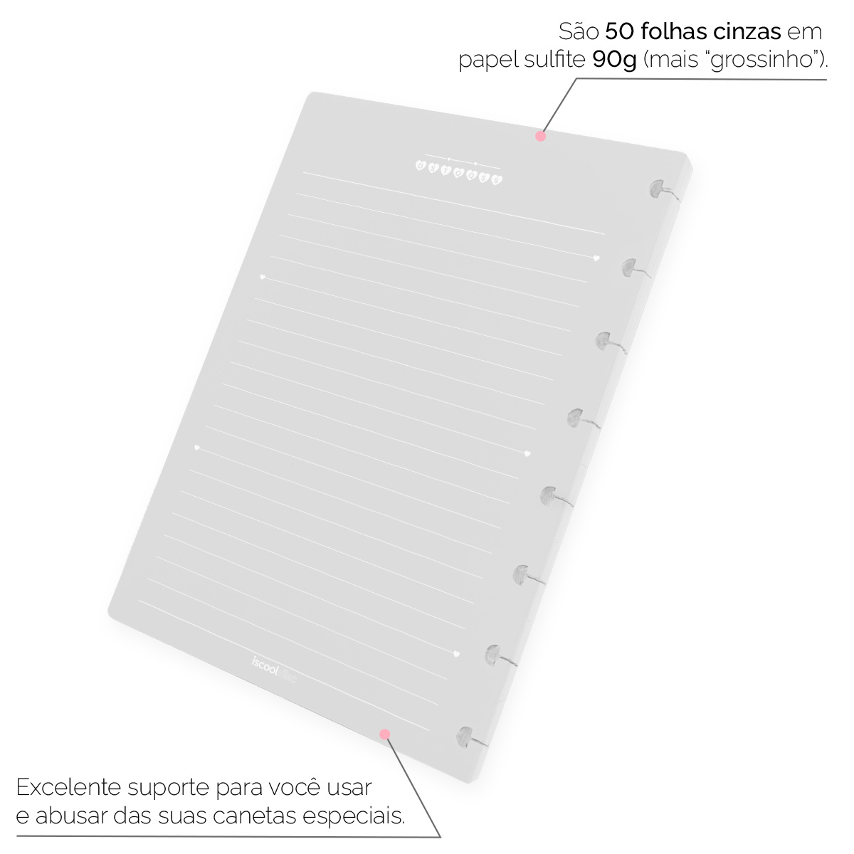 - Quantidade de folhas: 50 folhas pautadas com linhas brancas e cantos arredondados.