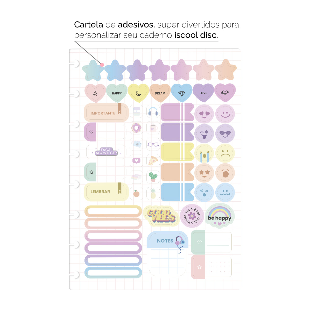 Acompanha ainda uma cartelinha de adesivos coloridos para você se divertir personalizando o seu caderno com a sua cara.