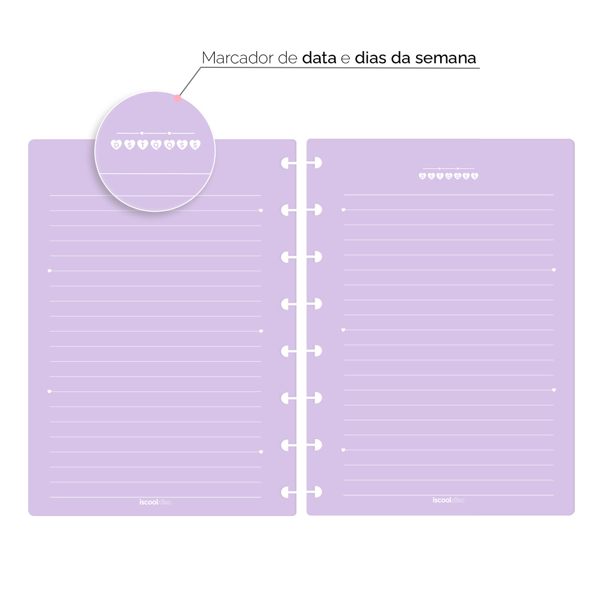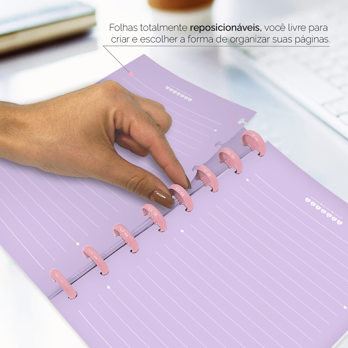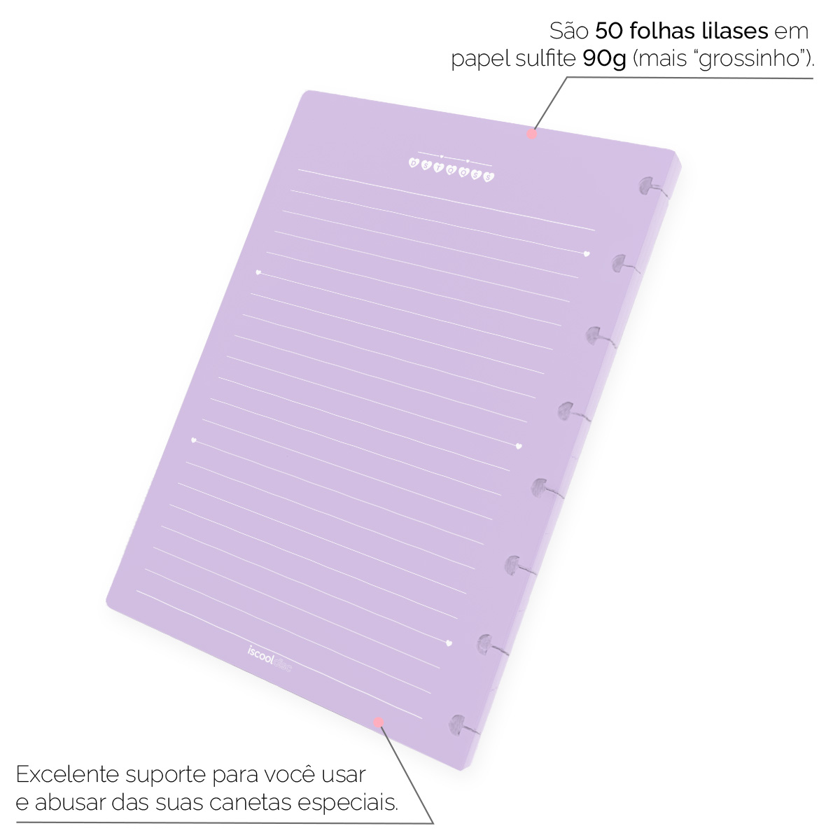 São 50 folhas pautadas com linhas brancas no tamanho G (20 x 27,5 cm) em papel sulfite/offset com gramatura de 90g, o papel mais “grossinho”, deixando rolar solta sua criatividade para utilizar suas canetas mais especiais! As folhas contêm 11 furos em formato de “cogumelo” proporcionando fácil encaixe e desencaixe nos discos, você livre pra montar seu caderno como quiser!