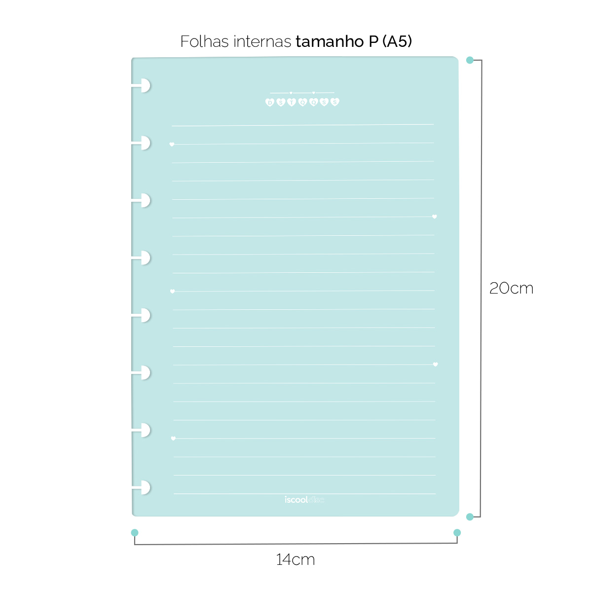 - Quantidade de folhas: 50 folhas pautadas com linhas brancas e cantos arredondados.
