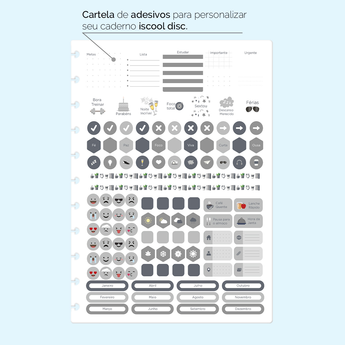 Refil ISCOOL DISC Planejamento Mensal Classic Grande 20 x 27,5 cm, 24 folhas, papel 120 g, com uma cartela de adesivos.