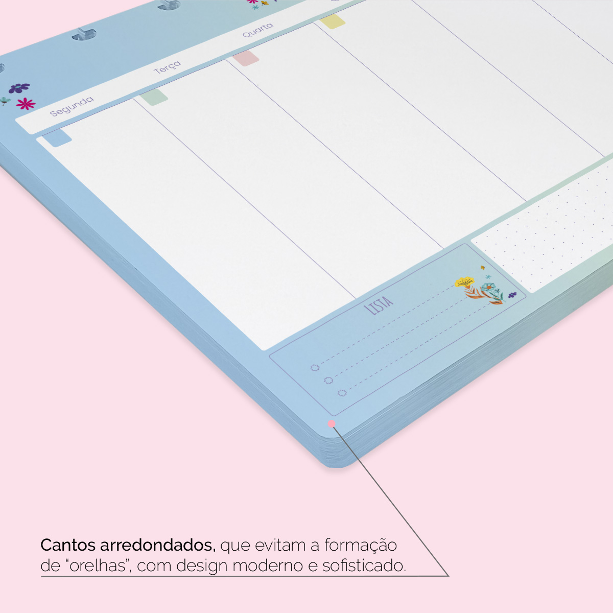 - Quantidade de folhas: 52 folhas decoradas, com cantos arredondados.