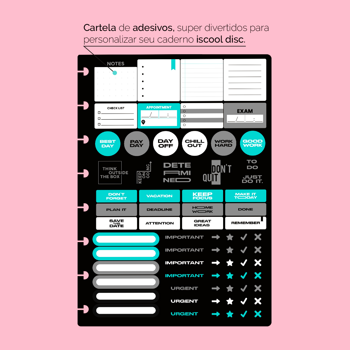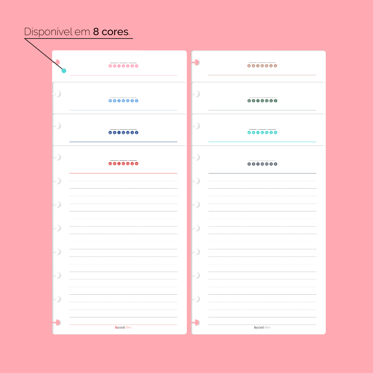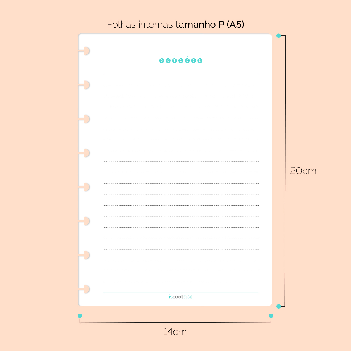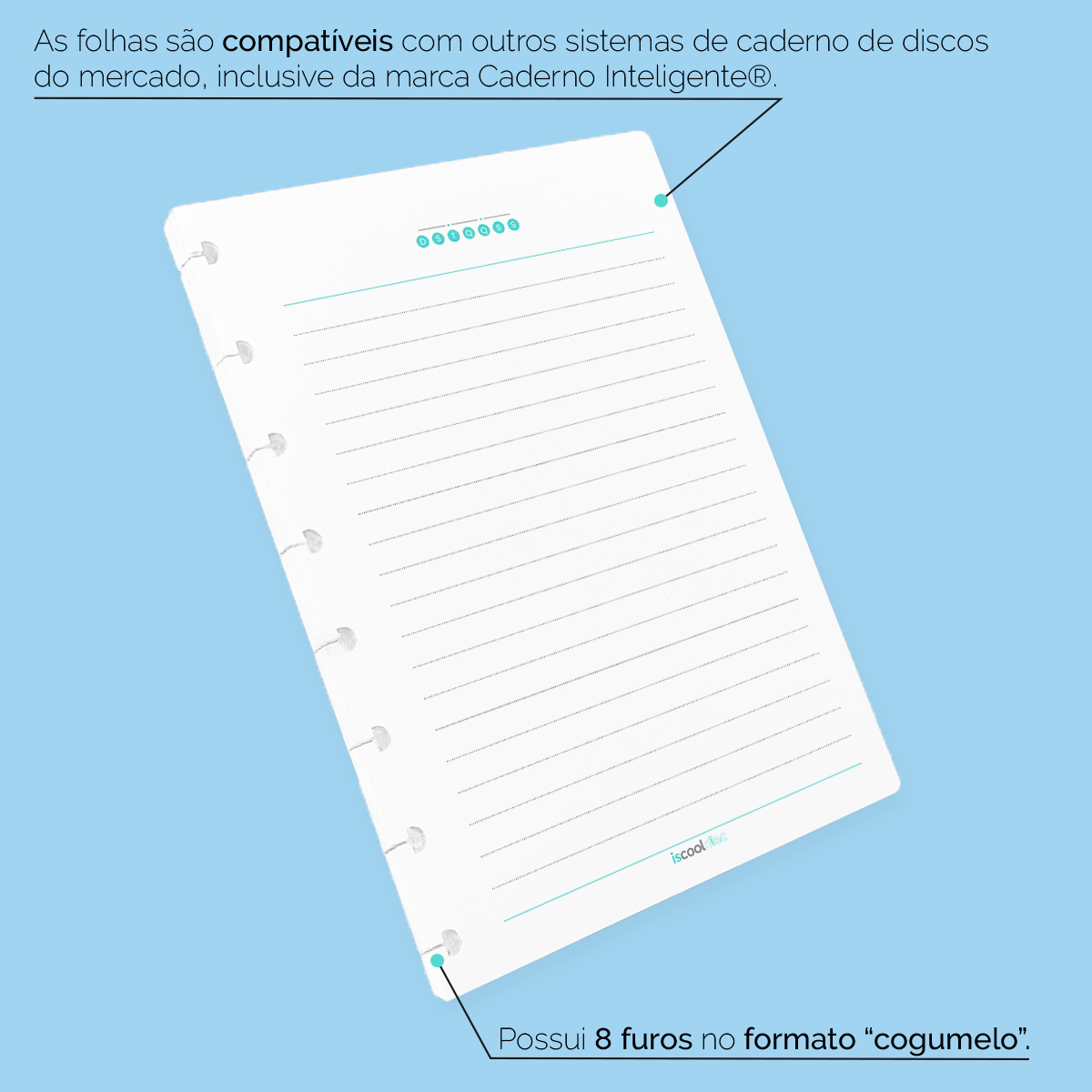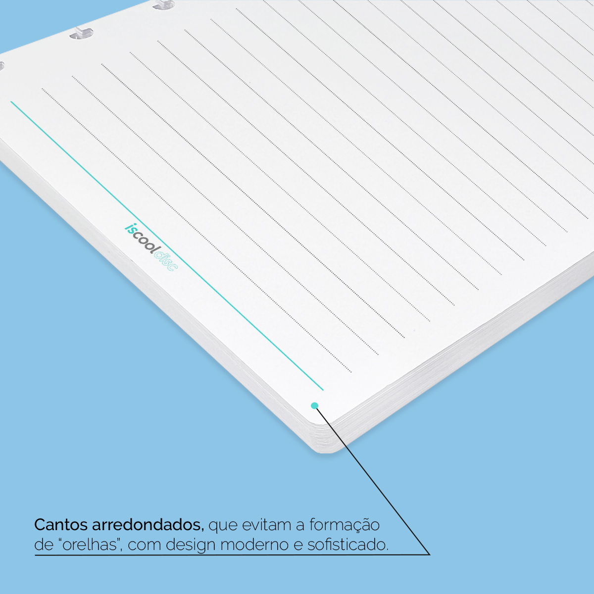 - Quantidade de folhas: 100 folhas pautadas com cantos arredondados.